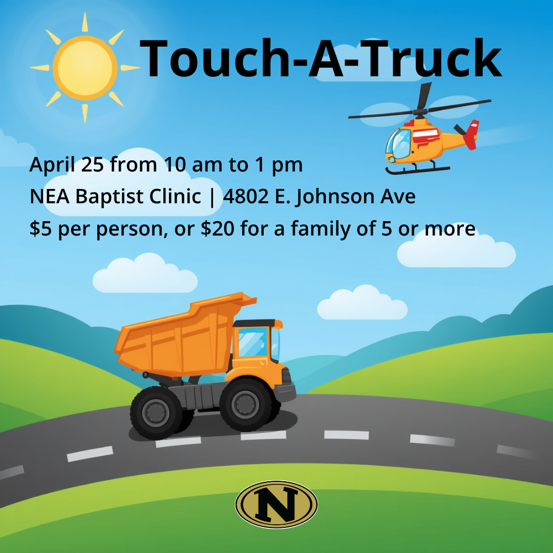 Touch-A-Truck is coming to town!Join us on April 25th from 10:00 AM – 1:00 PM at NEA Baptist Clinic (4802 E. Johnson Ave.) for a fun-filled day the whole family will enjoy! Kids will have the chanc...